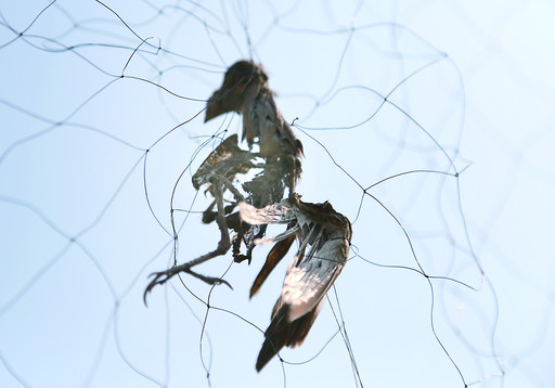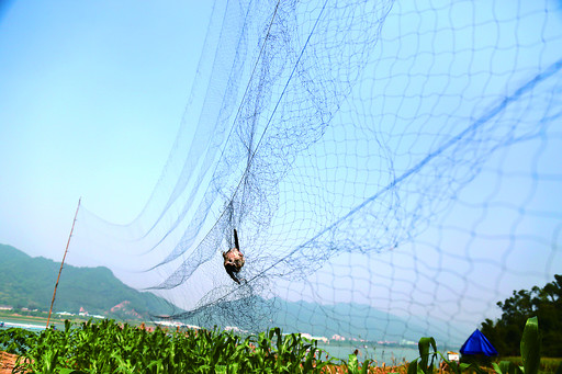 11月12日,在高要区小湘镇下围村的西江堤边,有人在一片玉米地里竖起了一幅用鱼线编织而成的大网,长约30米、高约4米,上面有鸟的尸体。而靠近上围村的西江堤附近,也竖立着一幅相同的大网,有一只小鸟刚被网线缠住,拼命挣扎也无济于事。 据路过的村民说,那些鱼网是有人故意拉起来的,目的就是捕捉野鸟,存在很长时间了,经常有鸟被网缠住。“拉网人”是谁,村民都不肯说。 记者看到,这里一边是西江,一边是山峦,雀鸟很多,它们稍不留神就会撞上鱼网,无法脱身。希望有关部门去处理,不要再让鸟儿丧命。