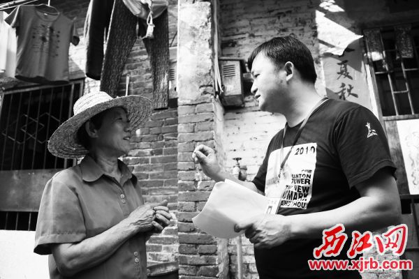 城东街道征拆干部何桂清在与建设二路塘尾段被拆迁户耐心沟通。记者 黄舒婷 摄