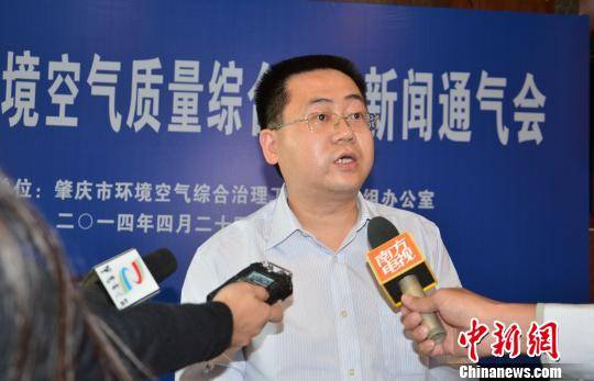 图为肇庆市环保局长陈金銮(右)在通气会后接受媒体采访。 黄耀辉 摄