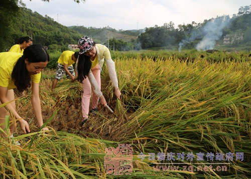广州大学大学师生帮助垢塘村农民割水稻。莫学松摄
