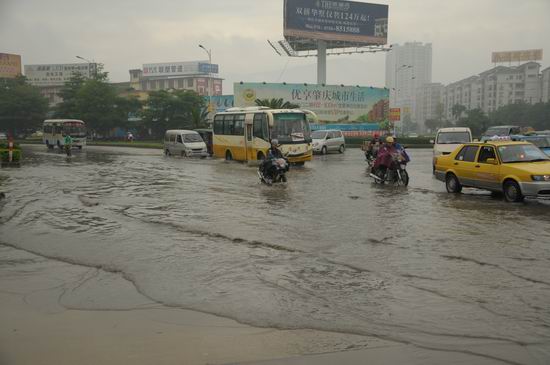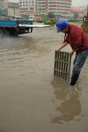 今日肇庆网讯 今天清晨端州城区普降暴雨,造成城区一些路段短时积水,城区渠网中心的干部职工紧急出动进行疏导。笔者跟随渠务工人上街,了解他们冒雨清疏工作的情景。