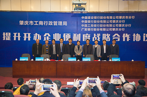 仪式上,市工商局局长冼以良、建设银行肇庆市分行行长梅元比、中国人民银行肇庆市中心支行行长万剑韬分别致辞。冼以良局长指出,当前我市商事制度改革面临的一些新形势、新挑战,需要做到三个“进一步”:一是我市商事制度改革要进一步深化。要进一步简政放权、放管结合、优化服务,着力做到求真务实、善于创新、勇于探索、创造经验,力争在新形势下我市商改再上新里程再创新辉煌。二是要进一步在便利化上下功夫、下气力。要大胆探索推行“多证合一”、集群注册、住所申报制等举措,不断提升开办企业便利度。三是将服务进一步优化。要不断延伸窗口服务,推行“证照分离”改革,加强政银合作,进一步提高政府公共服务效能。