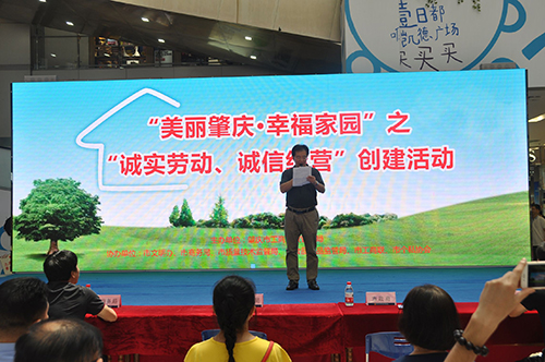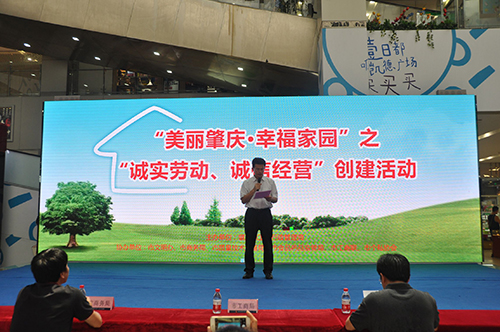 6月24日, 市工商局牵头会同市文明办、市商务局、市质量技术监督局、市食品药品监督局、市工商联、市个私协会、三村社区等单位在市城区端州路凯德广场开展“美丽肇庆•幸福家园”之“诚实劳动、诚信经营”创建活动。市政府副秘书长周文浣出席了活动并发表讲话。市工商局冼以良局长代表活动单位宣读了倡议书。